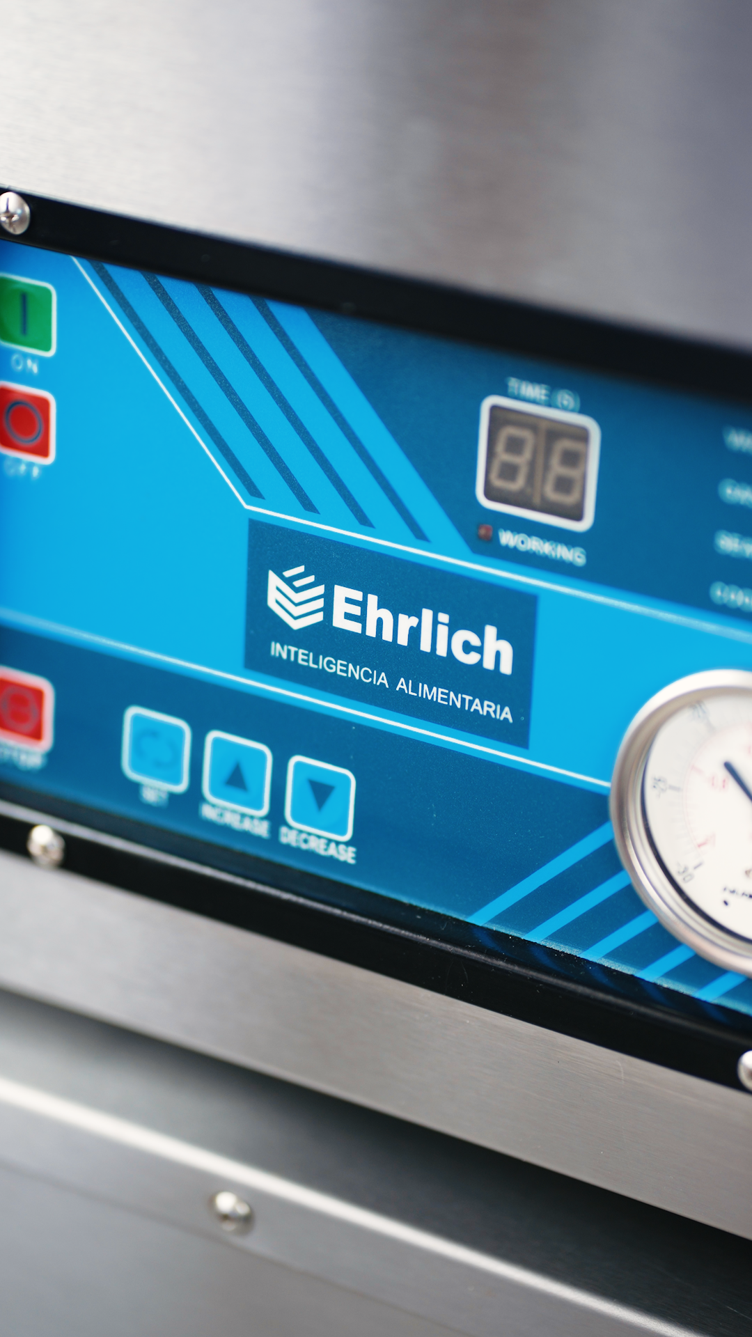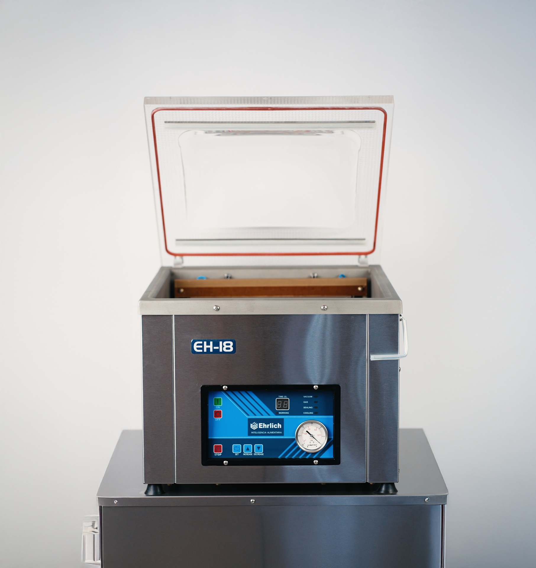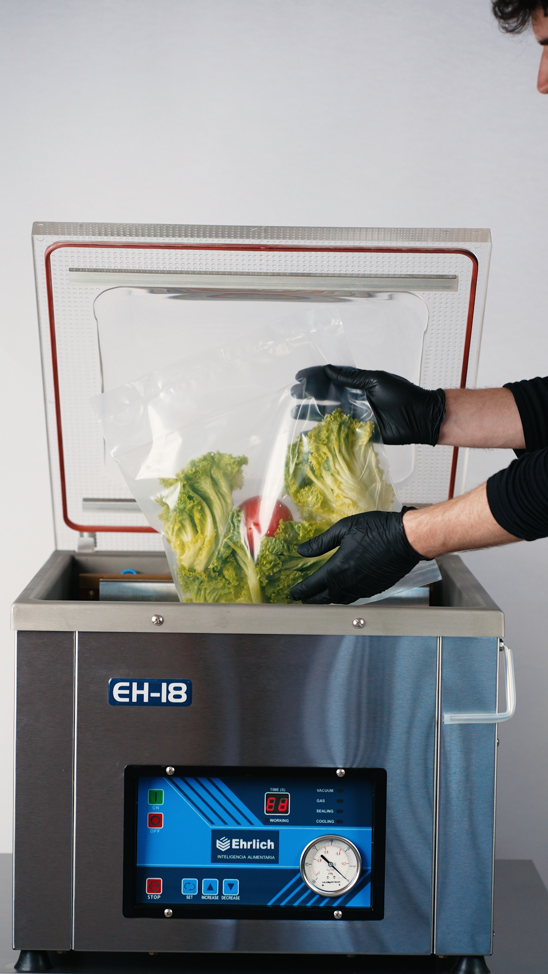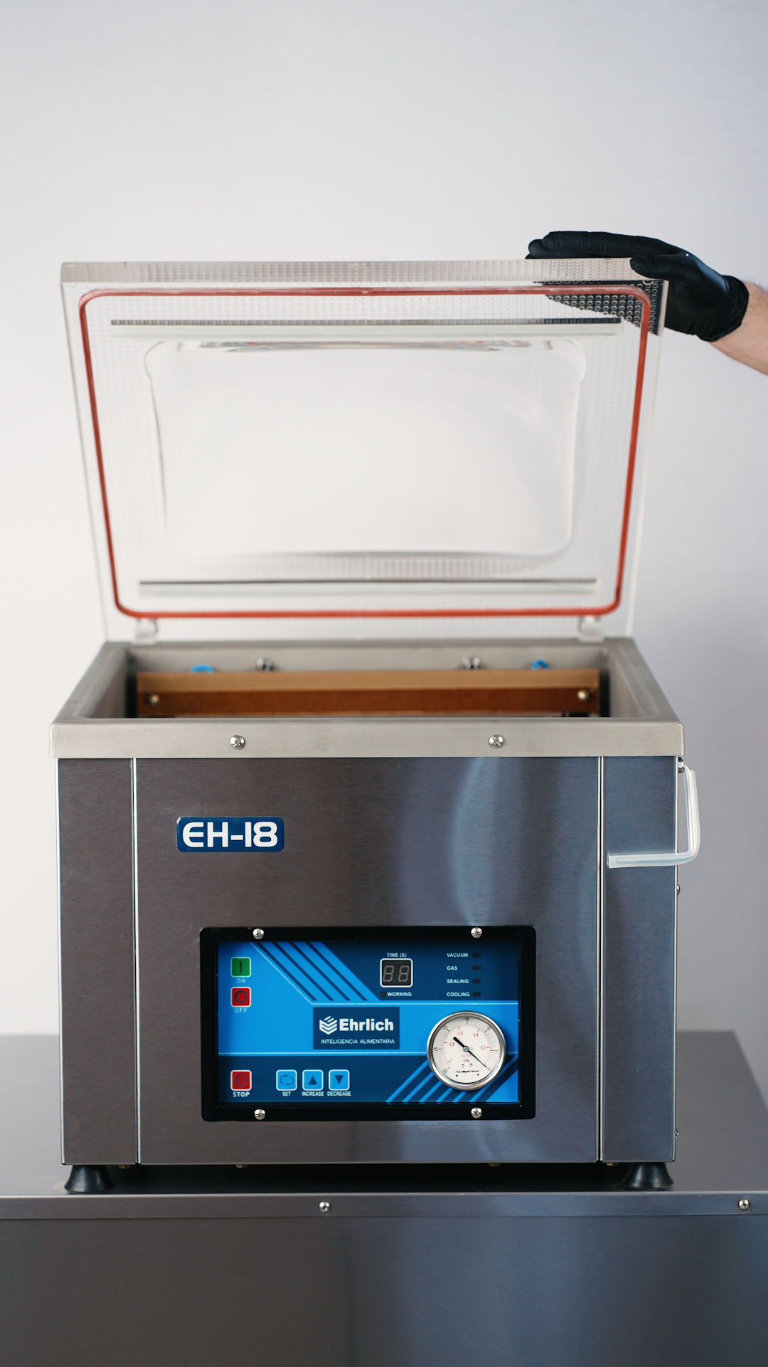 EH-18: Compacta, Potente y Versátil La Ehrlich EH-18 es una envasadora de vacío de campana con excelente rendimiento en espacios reducidos. Su cámara interna amplia permite trabajar cómodamente con alimentos sólidos, líquidos y productos más delicados como panificados o masas. Disponible con barra de sellado simple o doble de 44 cm, y con la opción de incorporar una bomba Busch, esta máquina se adapta fácilmente a distintas escalas de producción. Ahora también incluye función de marinado, ideal para impregnar sabores en cortes de carne, vegetales u otros alimentos en poco tiempo, gracias a la acción del vacío que favorece la absorción de líquidos y condimentos.